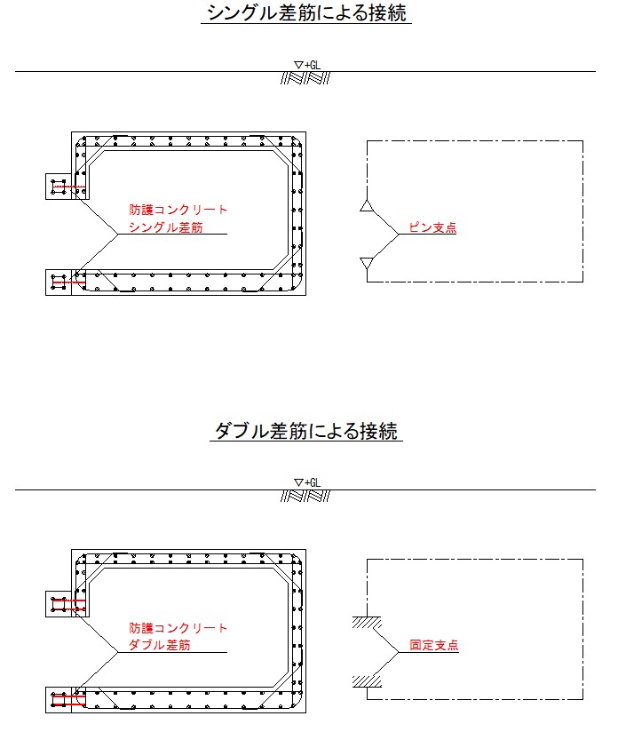 開口補強部におけるフレームと防護コンクリートの接続方法によって、構造の支点条件が異なります。
