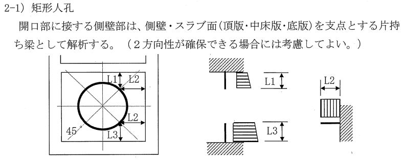 版構造で設計された場合、版の一部が欠損することで片持梁となる状態でも、応力が許容値以下であることを確認することで、開口に伴う影響がないと判断するケースです。※下部のL1およびL2箇所での照査が対象となります。