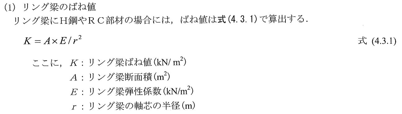 円形立坑の仮設計算で、弾塑性法を用いる場合には、切梁バネ定数として、円形リングの形状を考慮したリングバネを使用する必要があります。バネ値の算出方法は、以下の基準が参考となります。出典)シールド工事用立坑の設計/土木学会/トンネルライブラリー/P4-44