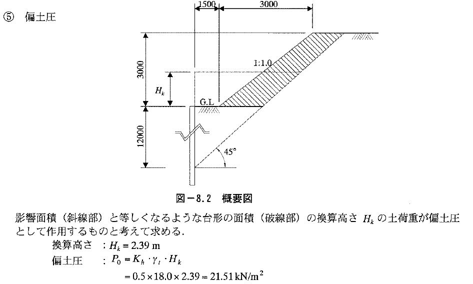 【計算例】では、下図のように、影響面積と等しくなる換算高の土荷重を偏土圧として計算する方法が示されています。