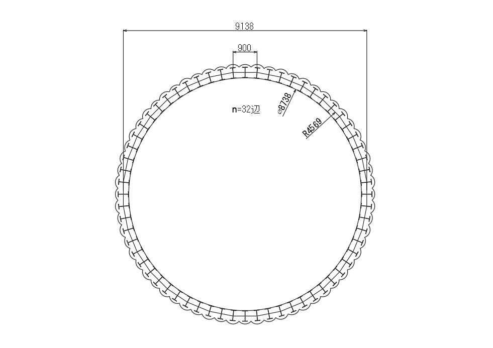 32辺の正多角形で、一辺が900mmの場合、内接円の半径は約4568.93mmとなります。