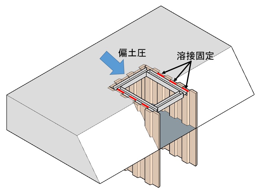 偏土圧が作用する土留の安定検討に対して定められた方法はありませんが、ひとつの考え方として、側面側の土留に反力が伝達するように固定(例:溶接固定)し、側面側の土留の剛性で安定性を確保するという方法が考えられます。