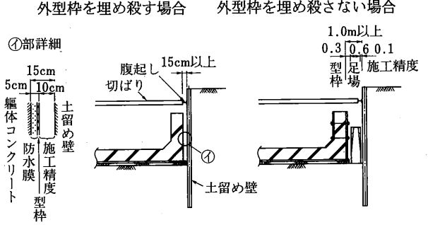 本体構造物との離れは、現場打ちかorプレキャストか、外型枠残置するかしないか、足場が必要か否かなど・・施工方法によって異なります。一例として以下に示します。