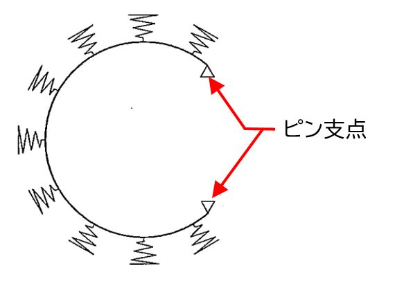 そこで、開口径率20%程度の条件で、リング解析を行う場合は、下図のようにピン支点があるため、開口の大小に関わらず、必ず支点反力が生じます。この支点反力を支えるために梁や柱が必要かどうかは、それぞれの条件を総合的に判断して、決定する必要があると考えます。