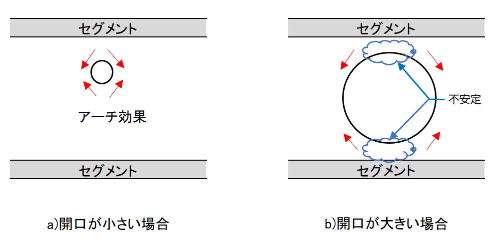 例えば、下図のようにa)開口が小さい場合には、荷重が左右に流れることで、アーチ効果が生じるため、梁や柱が無くても安定を保つと考えられます。一方、b)開口が大きい場合には、アーチ効果が中央部には届かずに、上部と下部の中央が不安定になるため、梁や柱が必要になると考えられます。