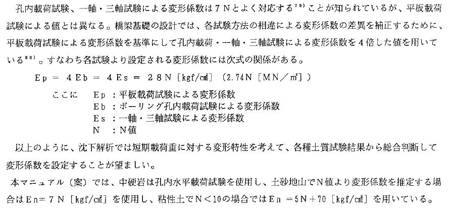 ➢変形係数の推定には、E=700Nによる方法やE=2800N(2500N)により推定する方法があります。想定するひずみレベルによって使い分ける必要がありますが、深度によって変形係数を使い分けるわけにもいかず、一律に設定しているのが現状です。推進やシールド工事などの解析では、次の考え方が示されていますので、それぞれの条件で判断する必要があります。・都市部鉄道構造物の近接施工対策マニュアル/鉄道総合技術研究所/平成19年1月(P160)