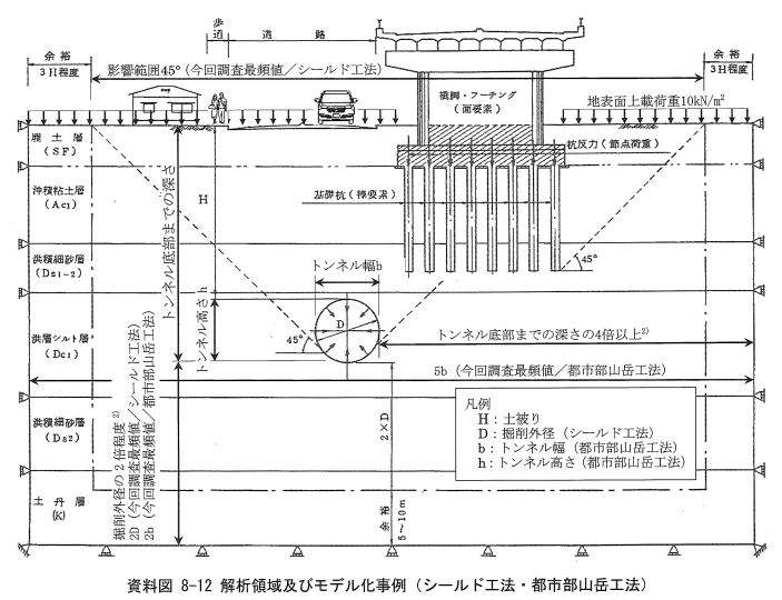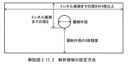 解析結果は解析領域の影響を強く受け、特にトンネル下方の領域の増大に伴って、応力解放によるトンネル底部の浮き上がり量が比例的に増加する。すなわちトンネル上部地表面の沈下量は小さくなる。これまで、鉄道構造物に近接するシールド工事の影響を評価した事例としては、上記の弾性係数や応力解放率を用いる場合には、概ね掘削外径の2倍程度としている実績が多く、解析値と実測値の比較結果も多く残されている。また、側方の解析領域については、最低でもトンネル底部までの深さの4倍以上は必要である、一般的にはトンネル底部までの深さの5倍程度としている例が多い。