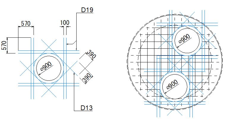 ・円形側壁の鉄筋は、曲率を考慮し長さを定める。